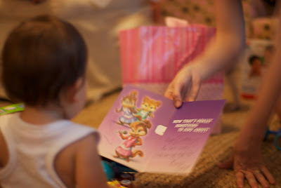 PRESENTS!!! She is becoming a pro at opening gifts! I gotta say though, this singing chumpmink card from her cousins Ari & Bayla was a huge hit! She still walks around the house dancing to the music!